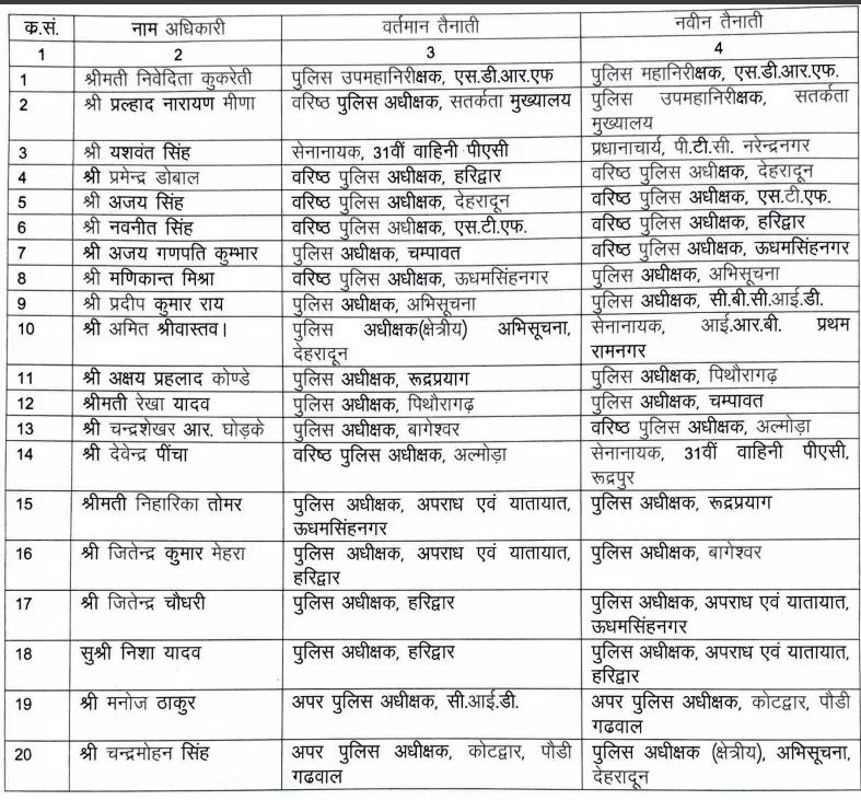 सचिव गृह शैलेश बगोली की ओर से जारी आदेश के मुताबिक, पुलिस उप महानिरीक्षक एसडीआरएफ निवेदिता कुकरेती को एसडीआरएफ में आईजी बनाया है। एसएसपी विजिलेंस प्रह्लाद नारायण मीणा को डीआईजी विजिलेंस बनाया है। 31वीं वाहिनी पीएसी में सेनानायक यशवंत सिंह को पीटीसी नरेंद्रनगर में प्रधानाचार्य बनाया है। एसपी अभिसूचना प्रदीप कुमार राय को एसपी सीबीसीआईडी बनाया है। एसपी हरिद्वार जितेंद्र चौधरी को एसपी अपराध एवं यातायात यूएस नगर, एसपी हरिद्वार निशा यादव को एसपी अपराध एवं यातायात हरिद्वार, एएसपी सीआईडी मनोज ठाकुर को एएसपी कोटद्वार और एएसपी चंद्रमोहन सिंह को एसपी क्षेत्रीय अभिसूचना के पद पर तैनात किया गया है।